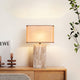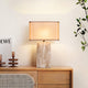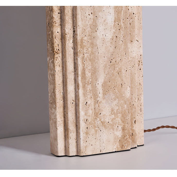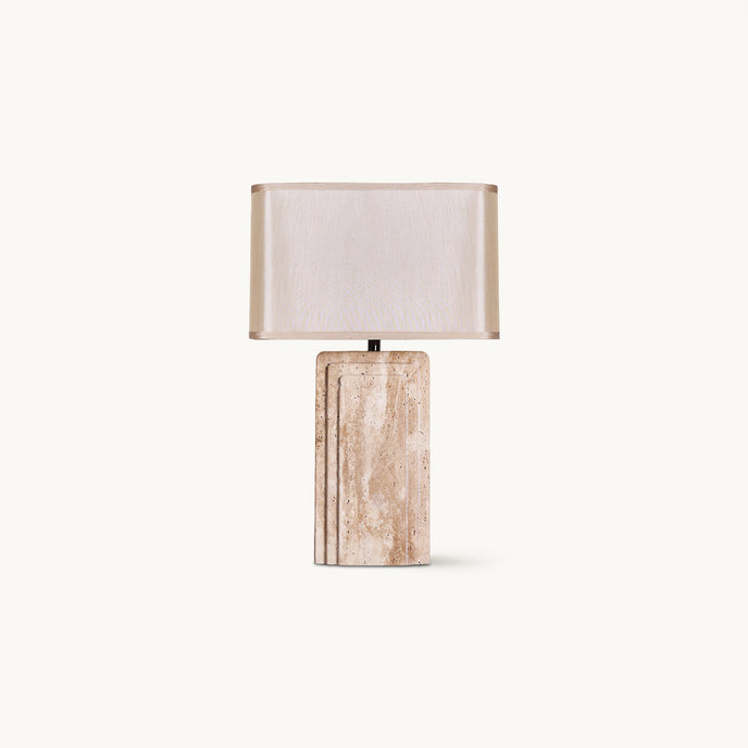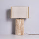 Elevate your space with the Mazzini Table Lamp from Mooijane. A solid travertine base with carved architectural lines pairs with a softly rounded rectangular fabric shade for a calm, cohesive silhouette. The shade diffuses a warm, ambient glow that highlights the stone’s natural veining and timeless character.