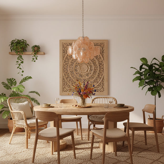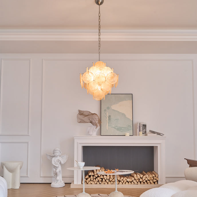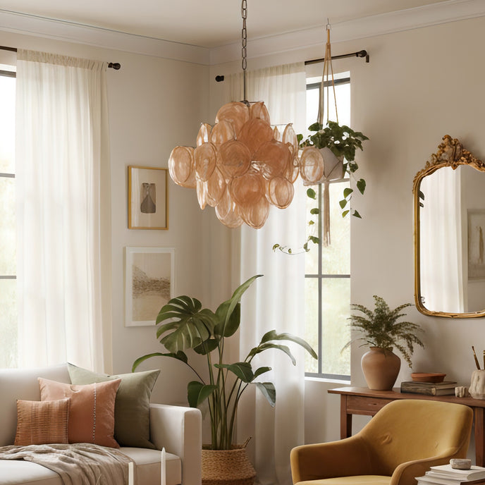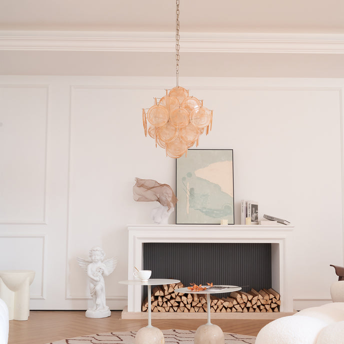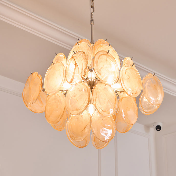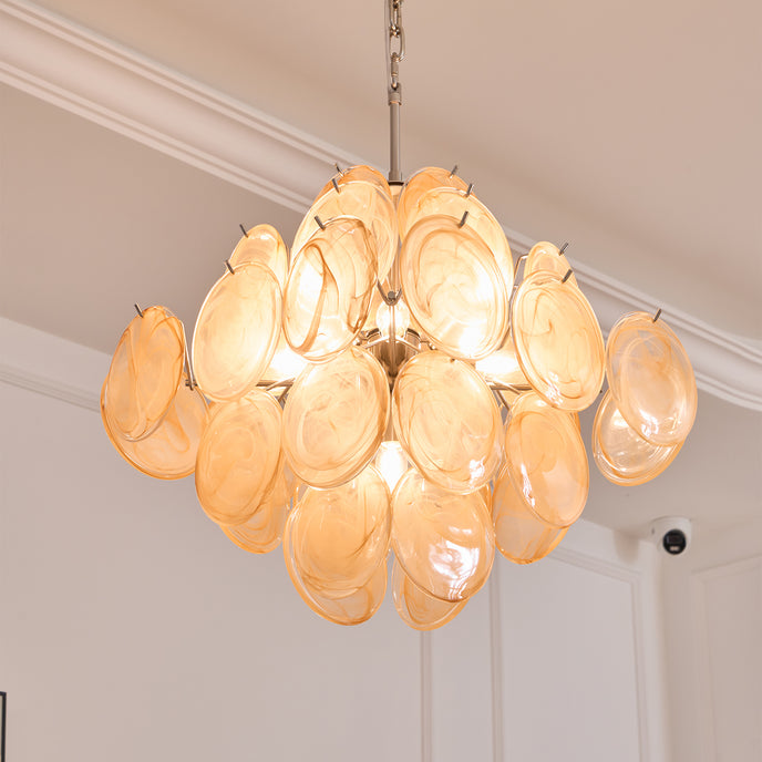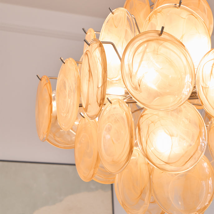 Add a touch of romance and elegance with the Murano Caramel Disc Chandelier from Mooijane. Handblown with soft, swirling pink tones, this stunning chandelier creates a mesmerizing visual effect as light bounces and diffuses in a warm and inviting glow. Ideal for living rooms, dining areas, or bedrooms, it brings sophistication and artistic flair to any space with its unique and luxurious design.
