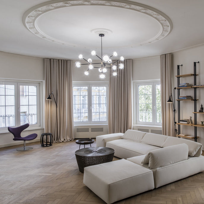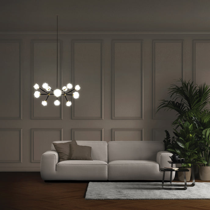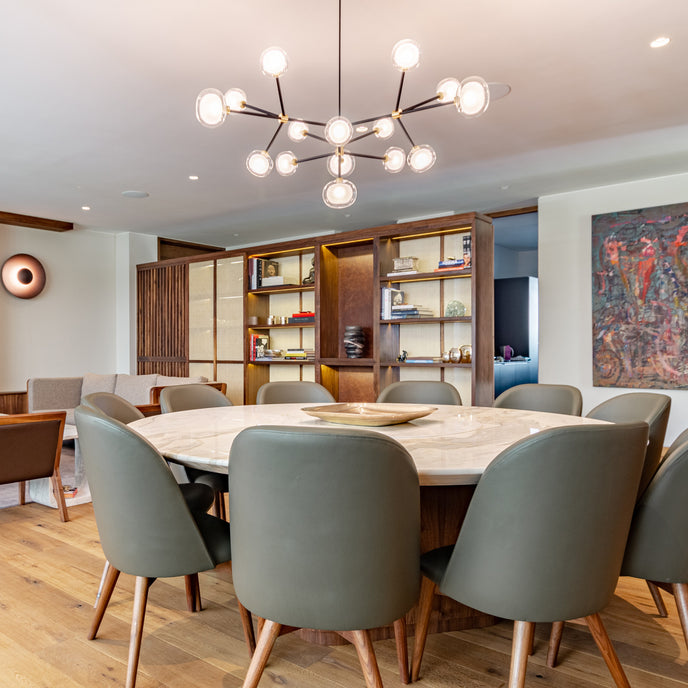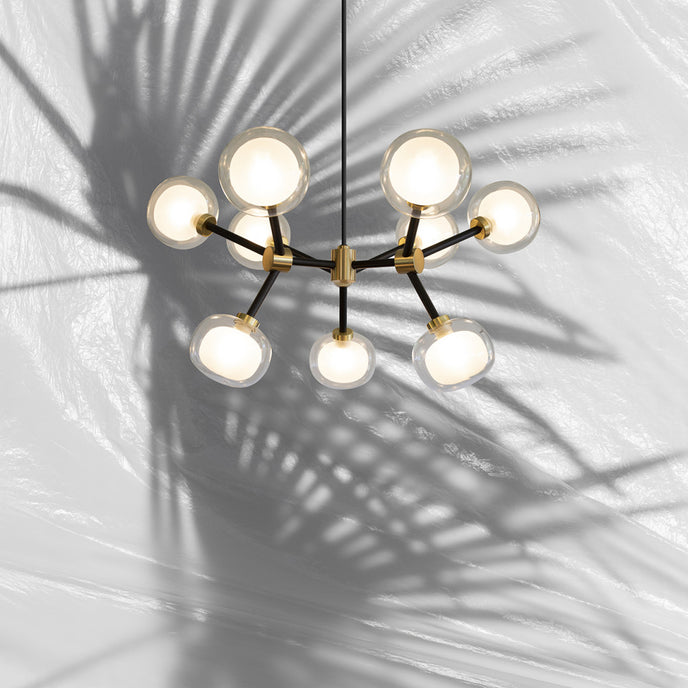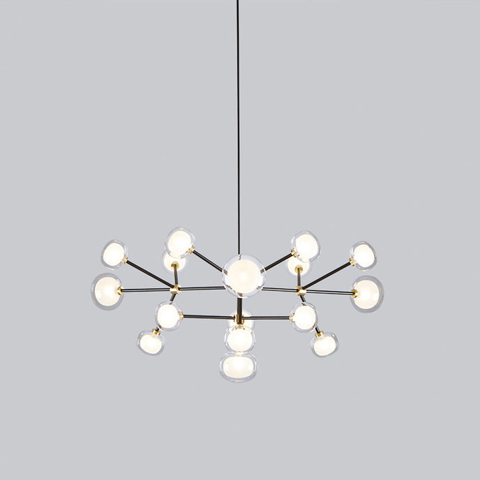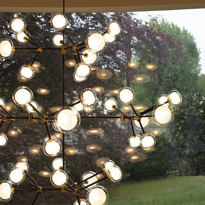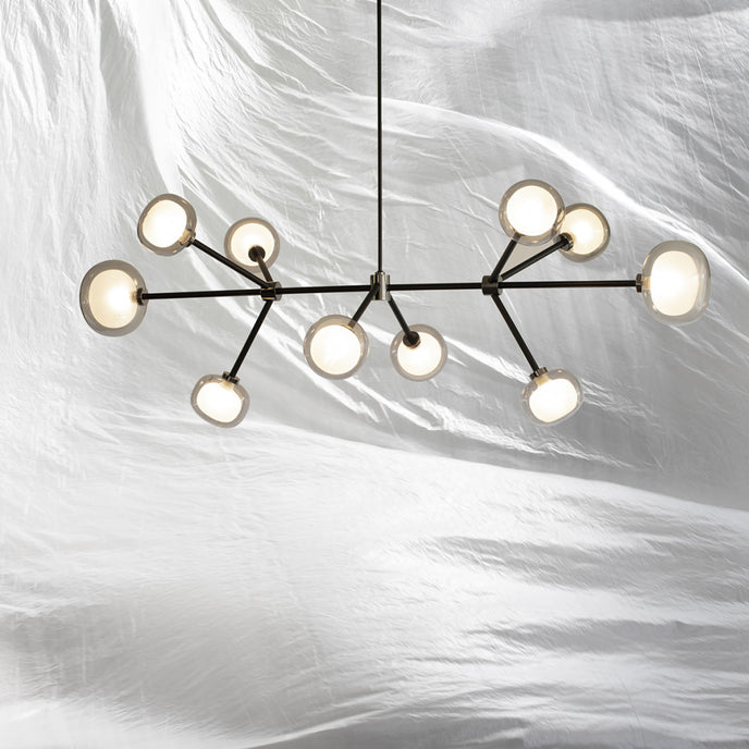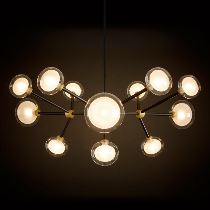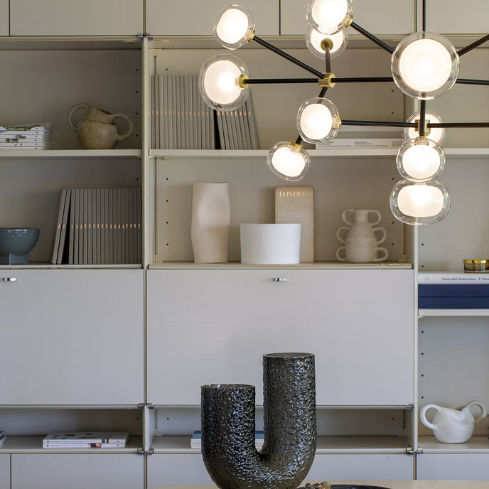 A sofisticação elegante do Candelabro Nabila é inspirada na busca do espaço sideral nos anos 1950. Modelado a partir do Sputnik, o quadro esférico de dupla face de Nabila em preto fosco com detalhes em cromo preto e discos de vidro borosilicato Smoke ou preto fosco com latão escovado e discos de vidro borosilicato transparente traz um toque único a um interior contemporâneo. Coloque na entrada ou sobre a mesa de jantar para completar sua estética.