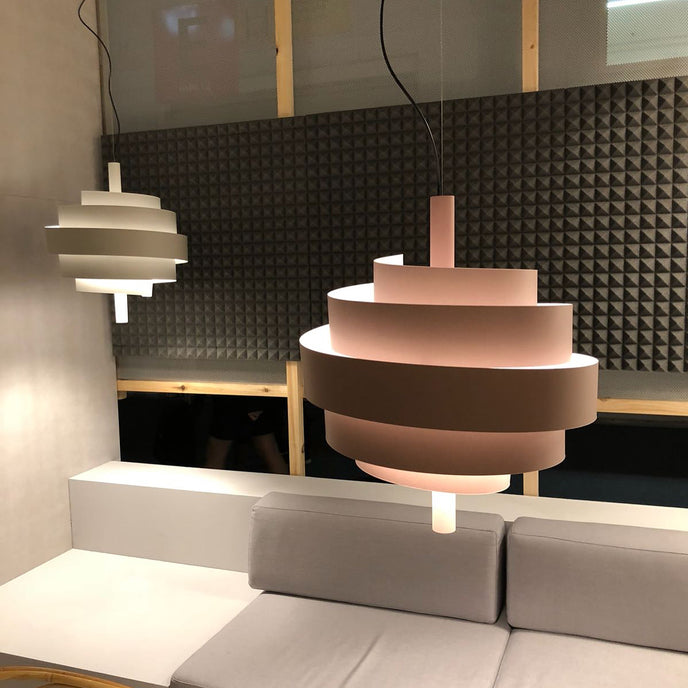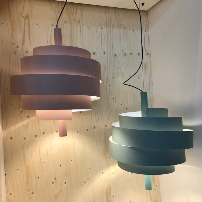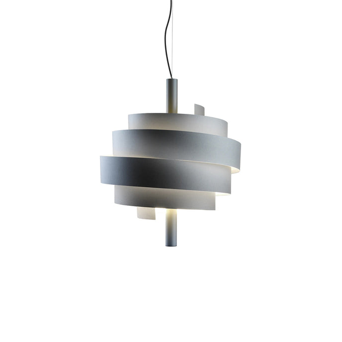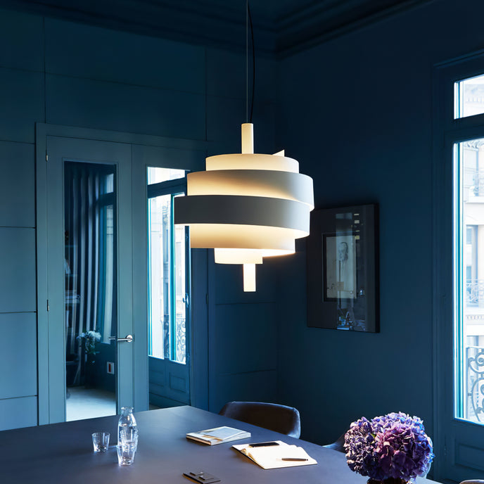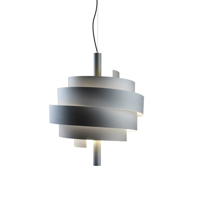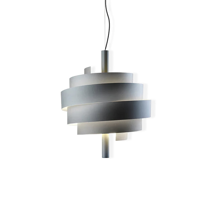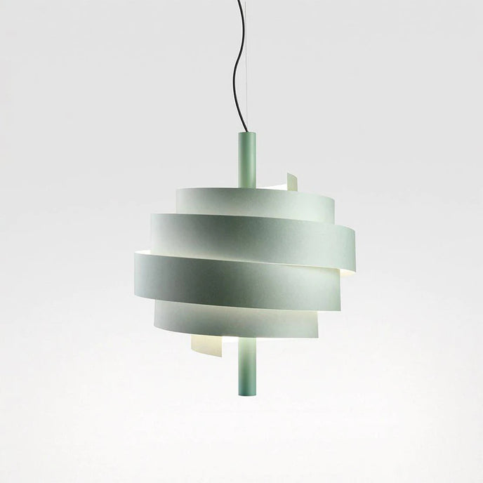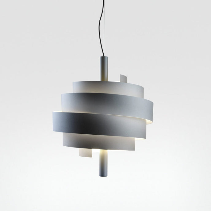 Uma coluna de metal central contém mais de 5 metros de banda laminada em espiral, envolvendo, protegendo e filtrando a luz em busca de beleza e conforto. Vários tipos diferentes de luz coexistem aqui: luz direta para baixo, luz refletida indireta e luz que se esgueira entre as bordas da espiral, iluminando a própria luminária com um brilho aconchegante e aconchegante.