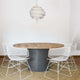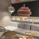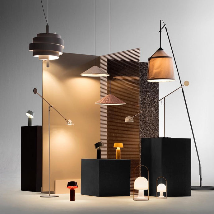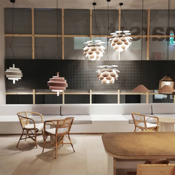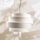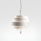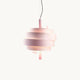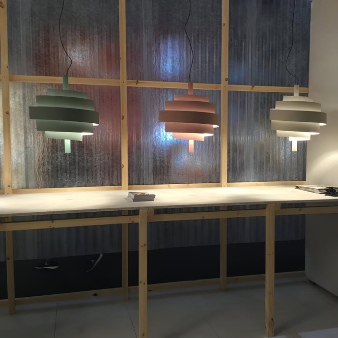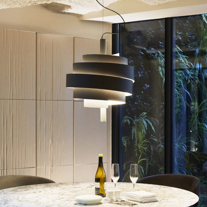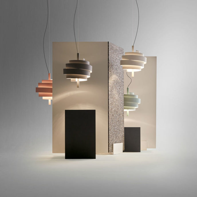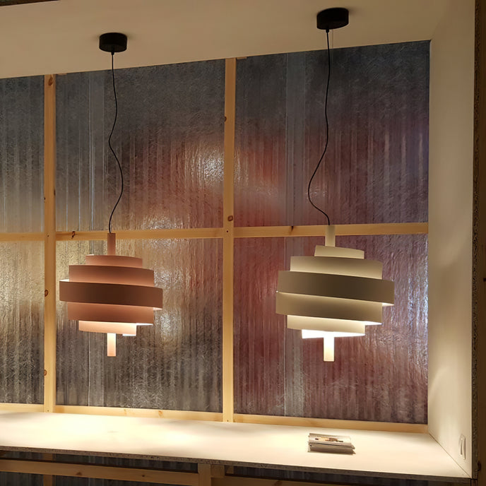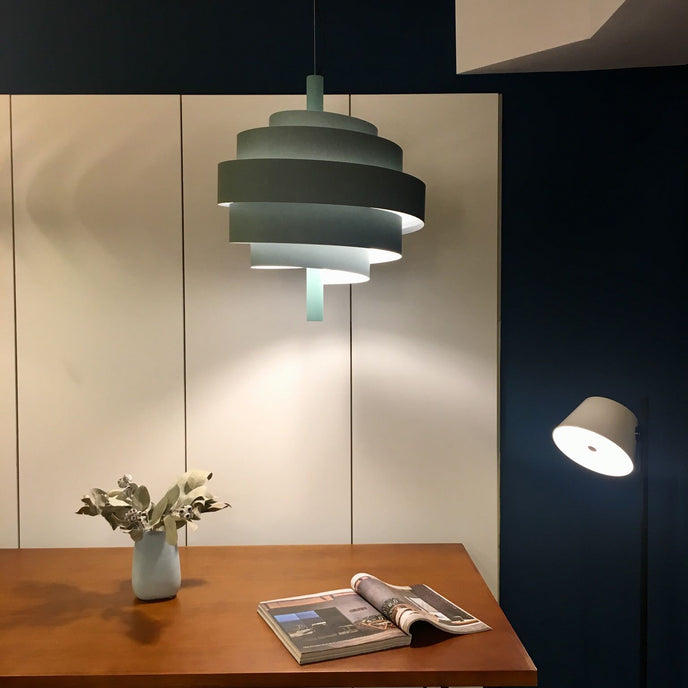 Uma coluna de metal central contém mais de 5 metros de banda laminada em espiral, envolvendo, protegendo e filtrando a luz em busca de beleza e conforto. Vários tipos diferentes de luz coexistem aqui: luz direta para baixo, luz refletida indireta e luz que se esgueira entre as bordas da espiral, iluminando a própria luminária com um brilho aconchegante e aconchegante.