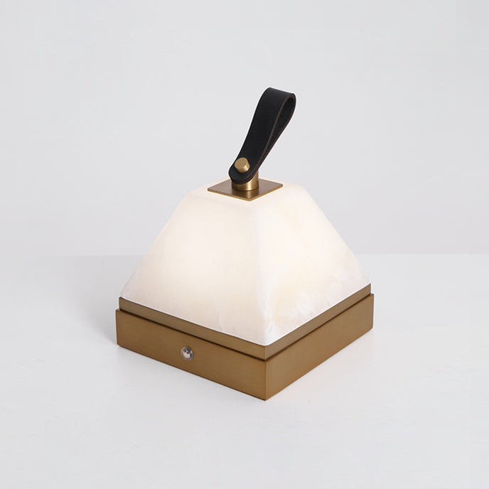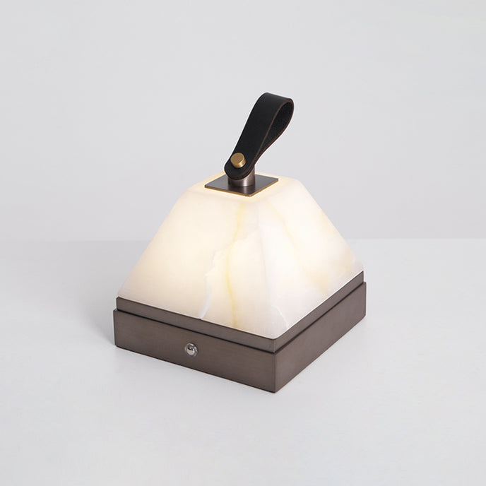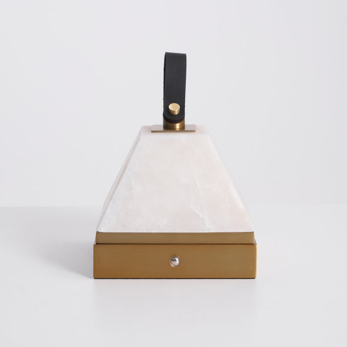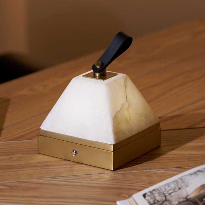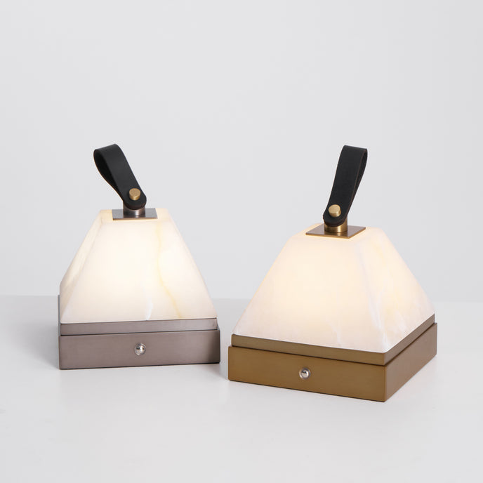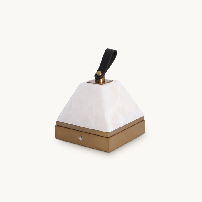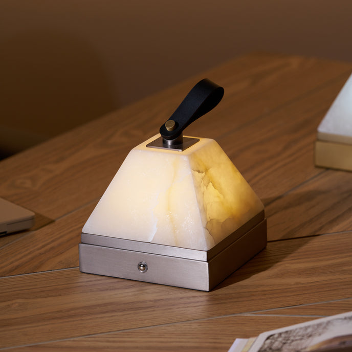 The Putzler Table Lamp from Mooijane combines natural alabaster and metal in a sleek, pyramid-inspired design. Its translucent stone body radiates a soft, calming glow, while the sturdy metal base adds contrast and stability. A leather handle enhances both aesthetics and portability, making it easy to move between spaces. With a built-in rechargeable battery, this cordless lamp is perfect for bedside tables, desks, or outdoor terraces. A versatile piece that blends elegance, function, and convenience—true to Mooijane’s design philosophy.