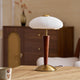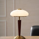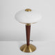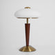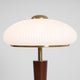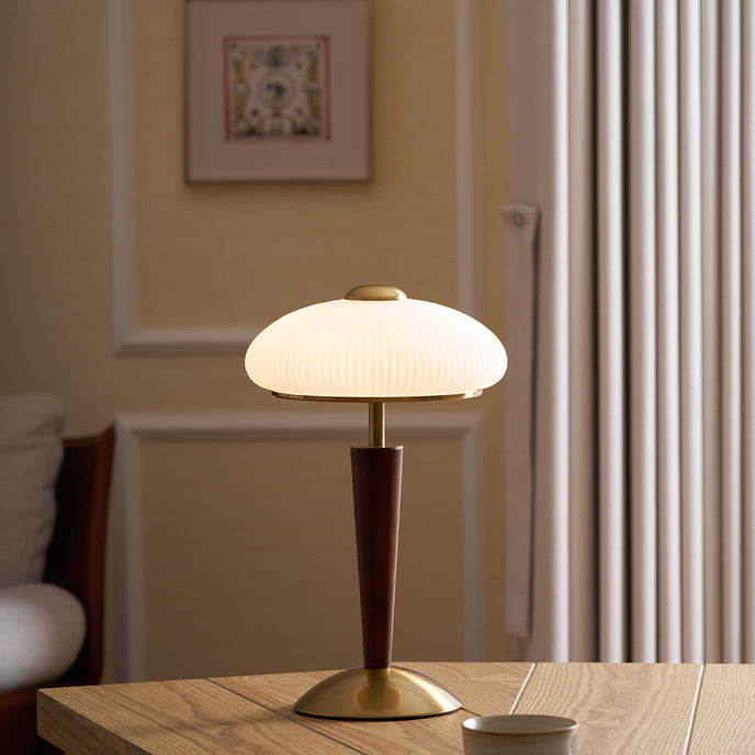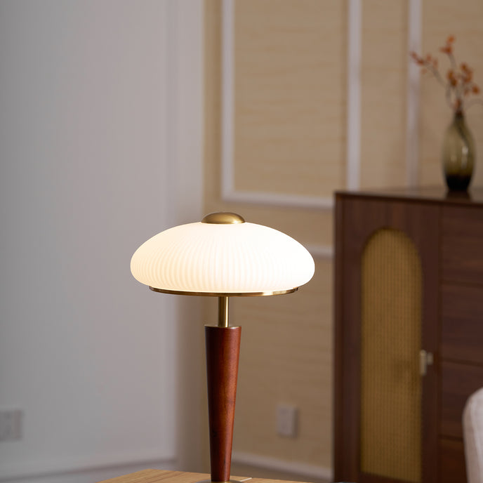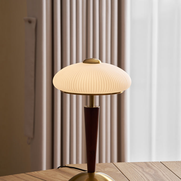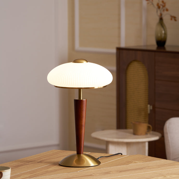 The Ronny Table Lamp from Mooijane features a solid antique gold metal base paired with a sleek dark wood column, bringing natural warmth and refined contrast to any space. A milky white glass shade with subtle striped detailing diffuses a soft, even glow—perfect for creating a cozy, ambient atmosphere. Ideal for bedrooms, studies, or living rooms, this elegant lamp combines timeless materials with modern simplicity for a sophisticated, understated look.
