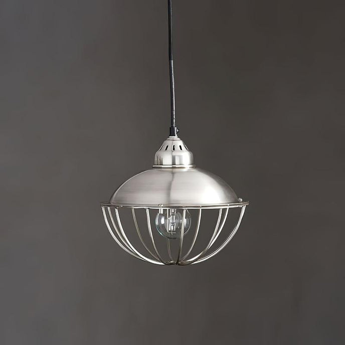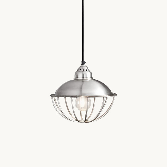 The Starboard Pendant Lamp is the perfect addition to any dining room. Made of silver metal, this vintage-style pendant light features a bowl cage design that adds a touch of elegance to your space. Illuminate your meals in style with this unique and functional pendant lamp.