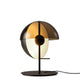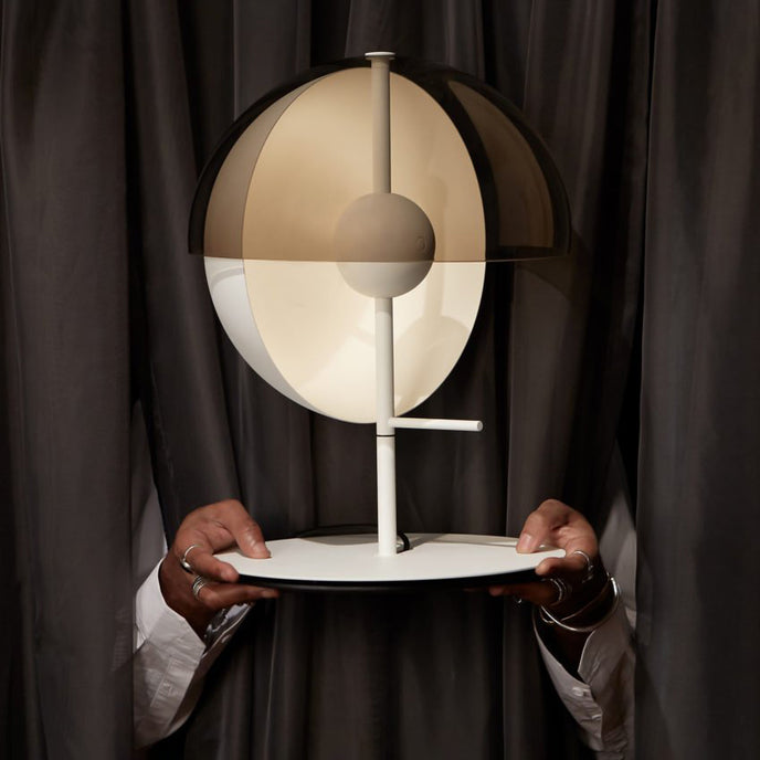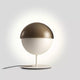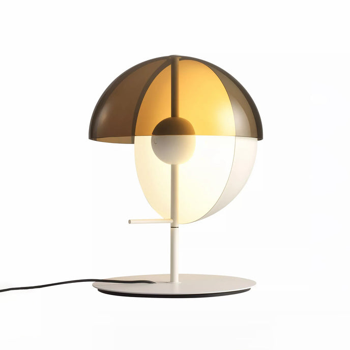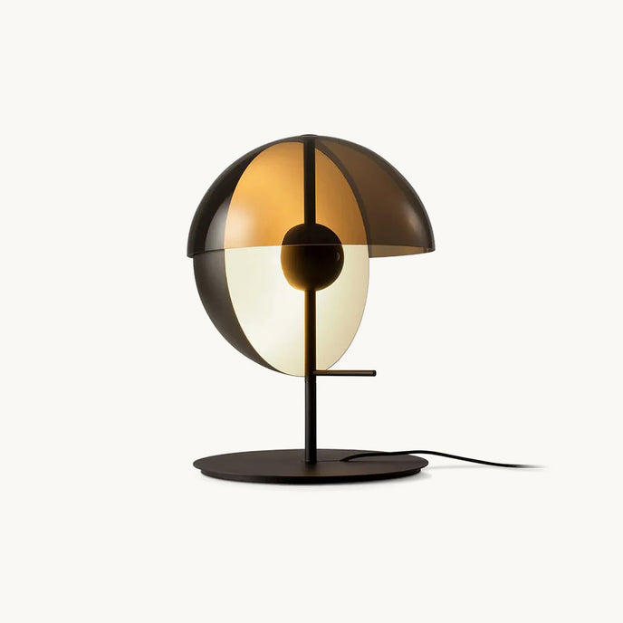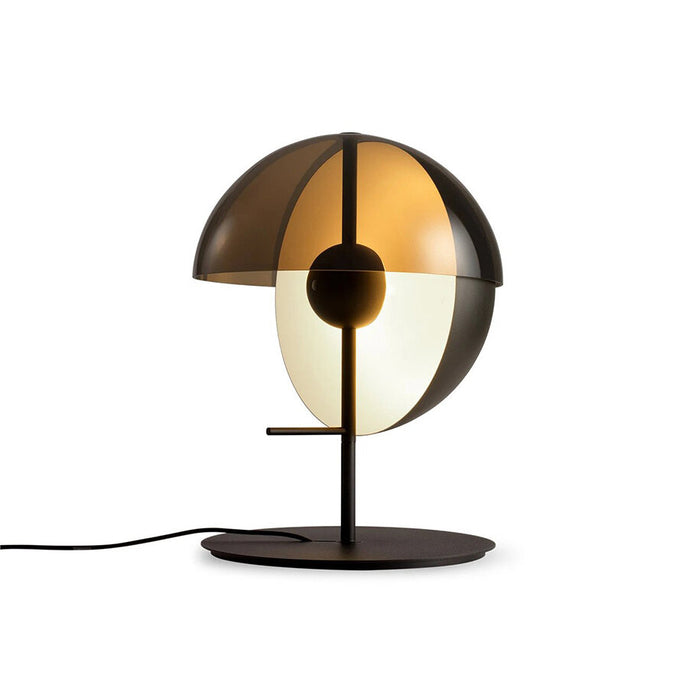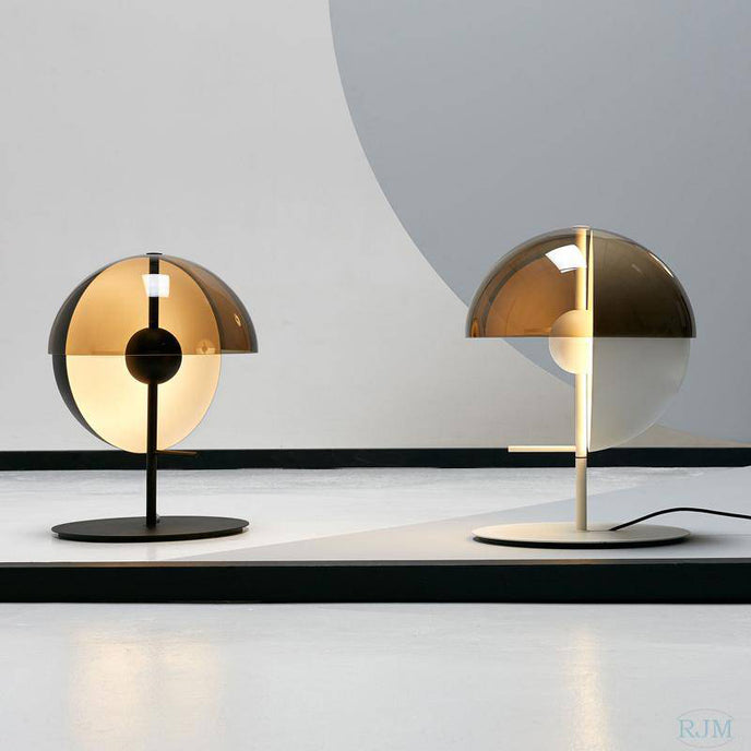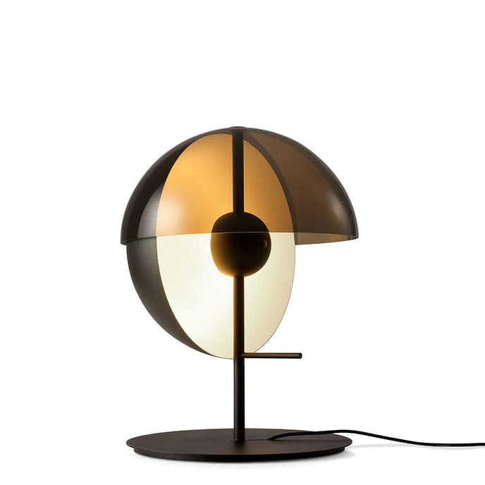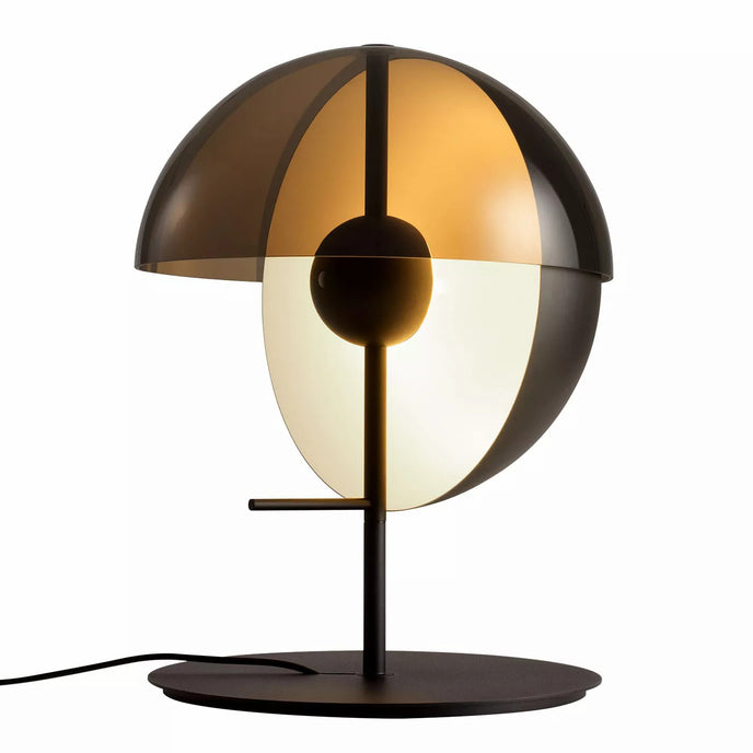 Candeeiro de mesa Theia com base e haste em ferro lacado. Difusor em alumínio lacado com interruptor incorporado. Semi-esfera vertical em metal lacado com interior a branco e abajur transparente fumado em metacrilato termoformado. Também disponível em 2 acabamentos diferentes: branco ou preto.