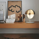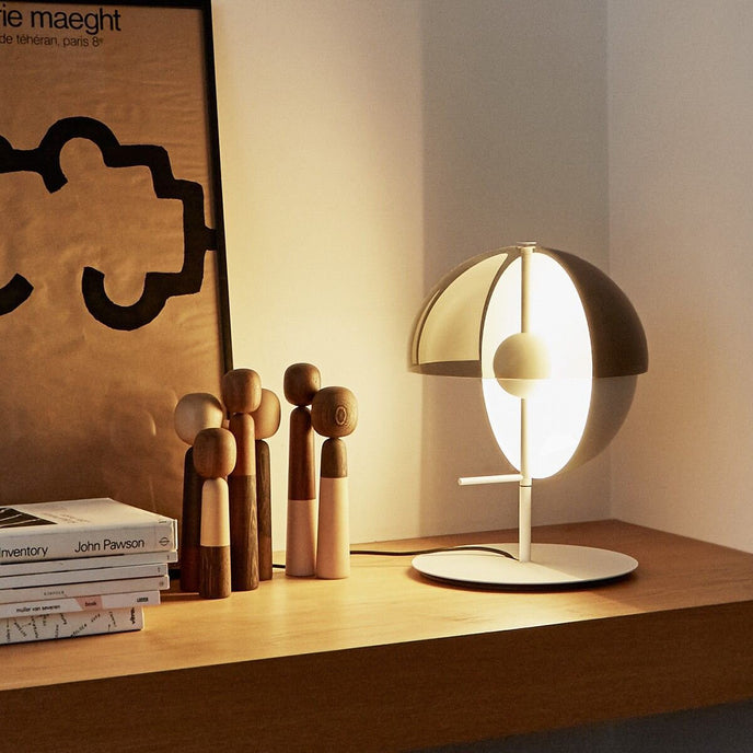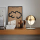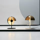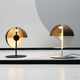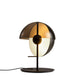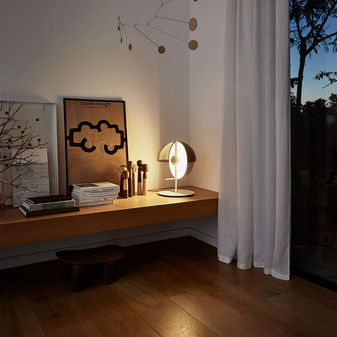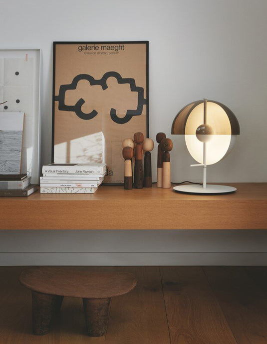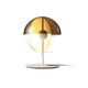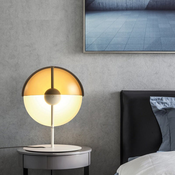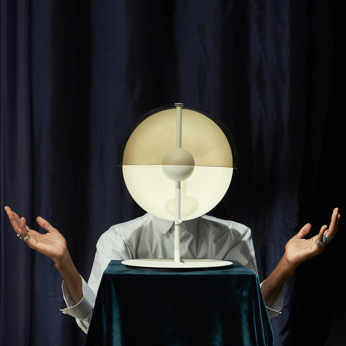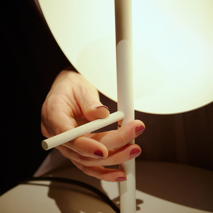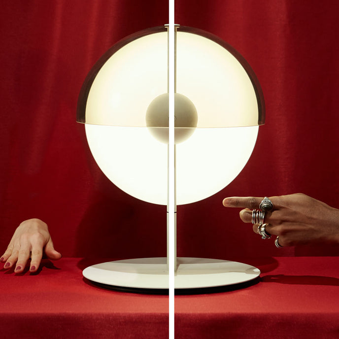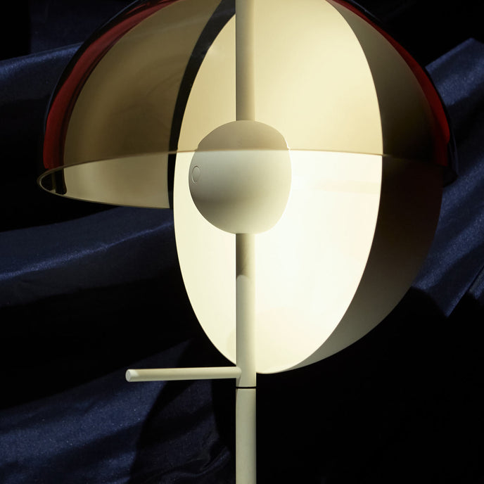 Candeeiro de mesa Theia com base e haste em ferro lacado. Difusor em alumínio lacado com interruptor incorporado. Semi-esfera vertical em metal lacado com interior a branco e abajur transparente fumado em metacrilato termoformado. Também disponível em 2 acabamentos diferentes: branco ou preto.