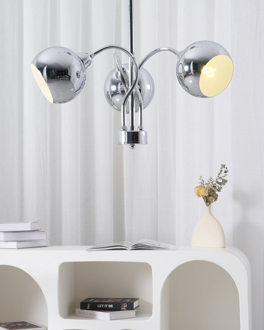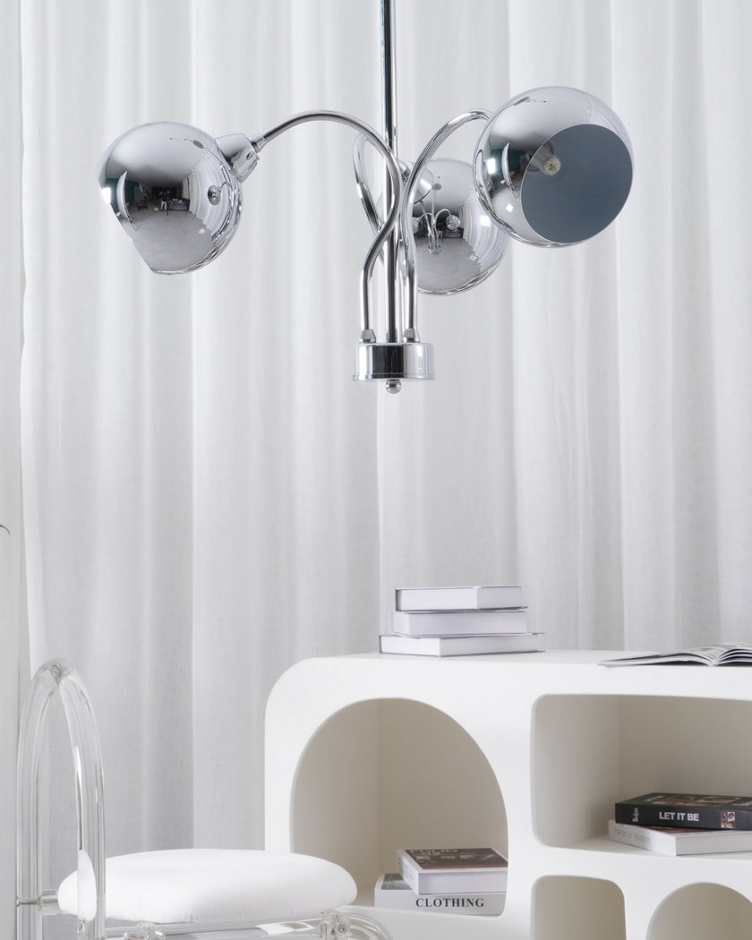 O estilo de design simples tem funcionalidade e beleza de luz e sombra. Torna-se um companheiro ideal neste espaço com a casa como protagonista. O processo de cromagem torna a lâmpada tão deslumbrante quanto um espelho.