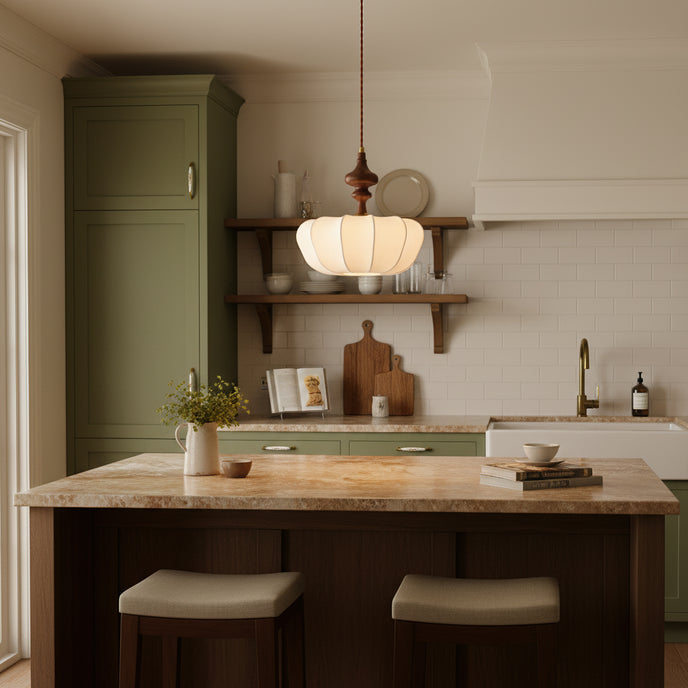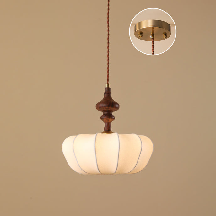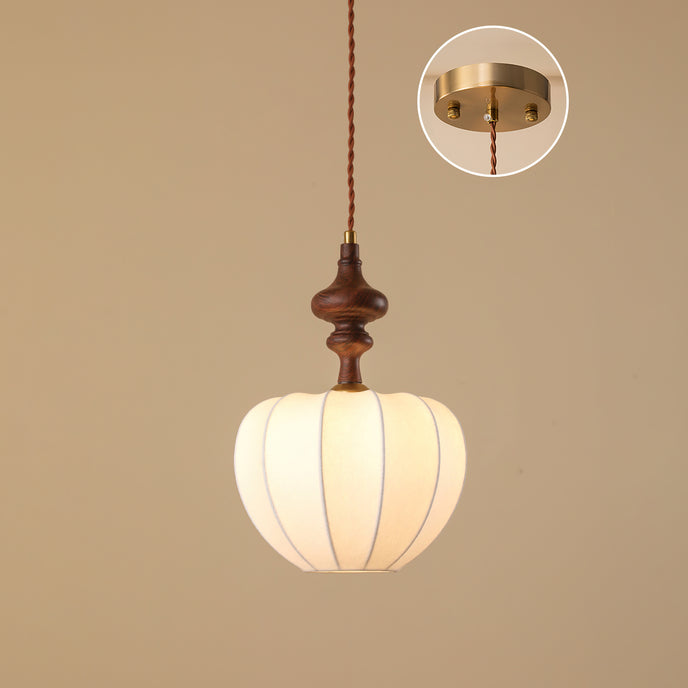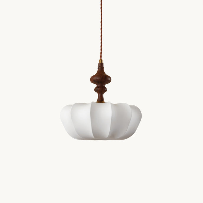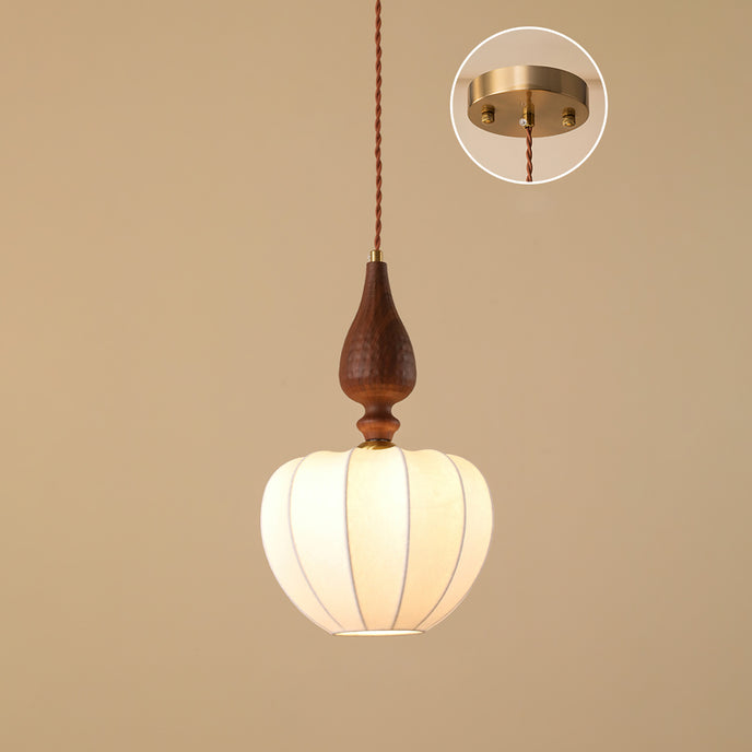 The Weiana Pendant Lamp by Mooijane embodies tranquil elegance with its graceful curves and natural materials. A silk-wrapped shade diffuses a soft, cloud-like glow, complemented by a hand-polished solid wood top that adds warmth and refinement. Subtle metal accents, inspired by the delicate harmony of petals and lanterns, enhance its artistic appeal.